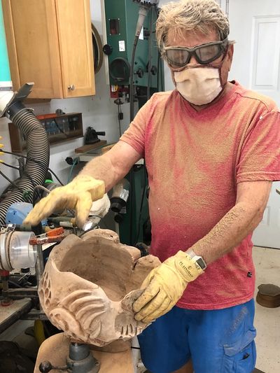 A friend had given me this Burl. The branch of its tree had fallen close to the ground, and as the Burl developed over the years, it consumed some of the local stones I was unaware of. From my experience working with Burls, you never know what to expect as it grows and twisters into many forms and shapes. It is almost like an oyster, never knowing if you will find a pearl. My first impression of it was that it had the structure of something human. As I started to carve it and go into depth, I discovered stones and chambers in Burl's exterior, and deeper into the interior was a beautifully twisting blood-red-like wood grain. The branches that grew out of it became supporting legs as if it was walking. This was a very rare find for me as I never knew what to expect with the removal of its exterior shell. All my friends and family who had looked at this piece found something distinctive in it. It was like looking at the clouds and seeing things in them.